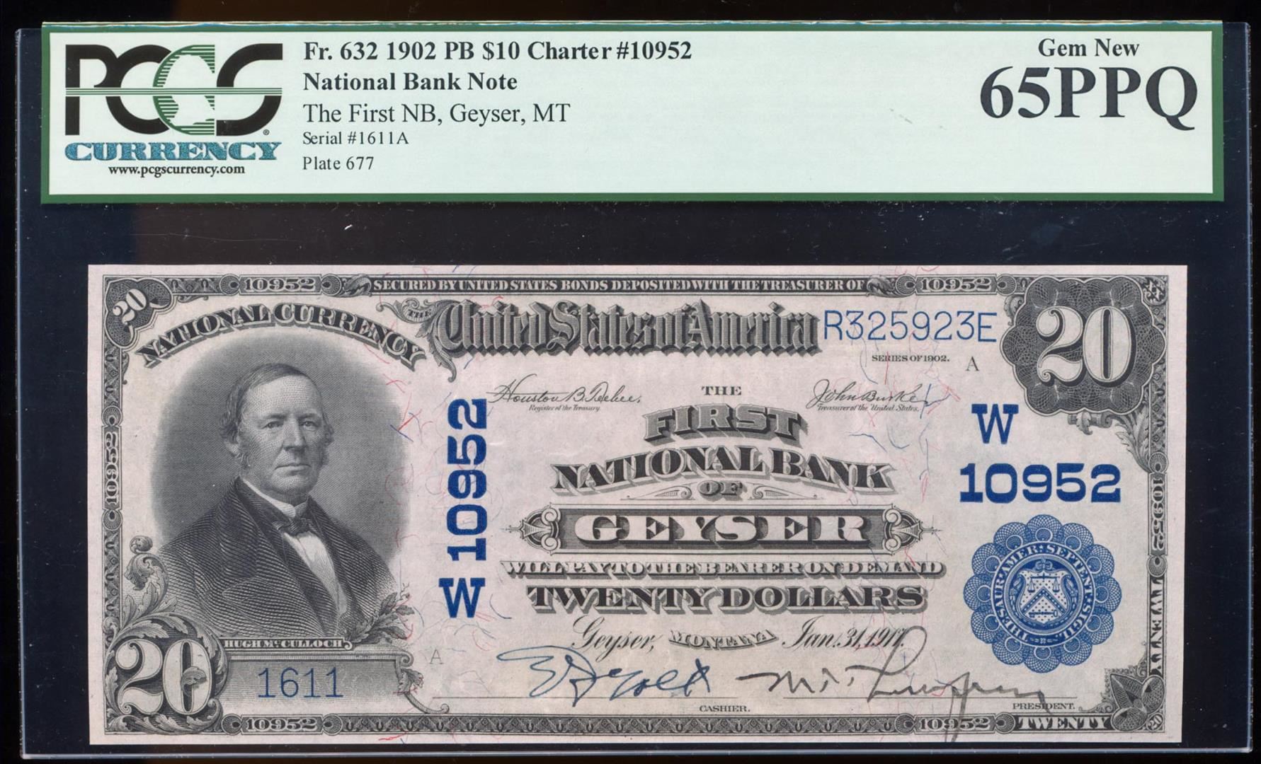 One 1902 PB $10 First National Bank of Geyser, MT CH# 10952 PCGS Gem New 65PPQ. PCGS Graded.