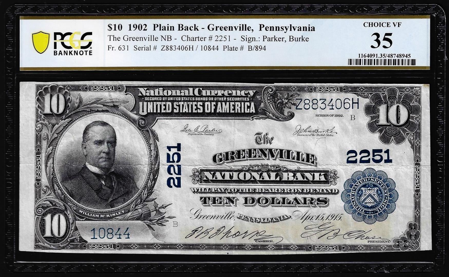 One 1902 PB $10 NB Greenville, PA CH# 2251 National Currency Note PCGS Choice VF 35. PCGS Graded.