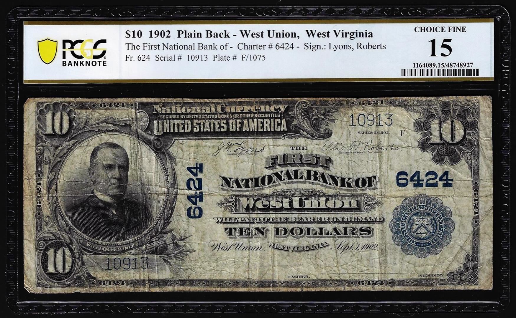 One 1902 PB $10 NB of West Union, WV CH# 6424 National Currency Note PCGS Choice Fine 15. PCGS Graded.