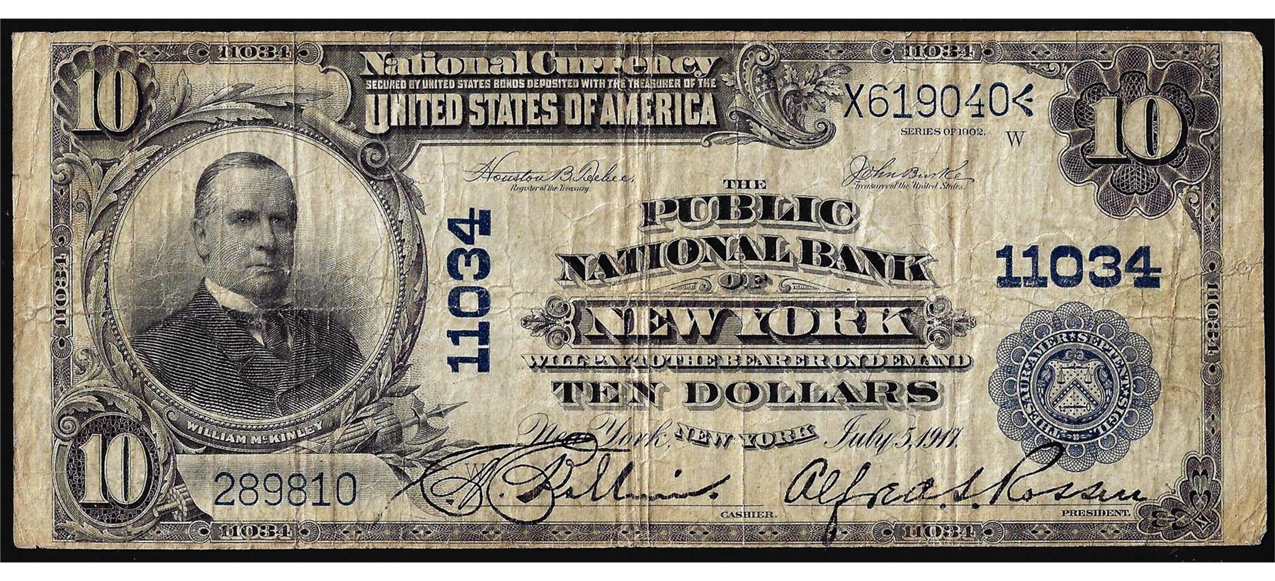 One 1902 PB $10 Public National Bank of New York, NY CH# 11034 National Currency Note.