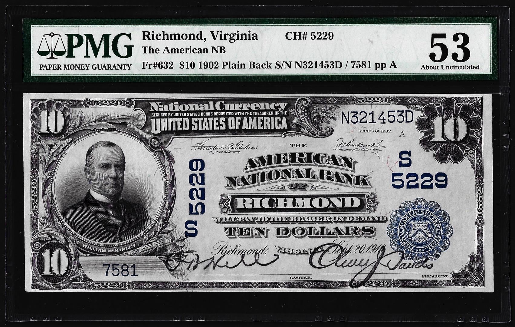 One 1902 PB $10 Richmond, VA CH# 5229 National Currency Note PMG About Uncirculated 53. PMG Certified.