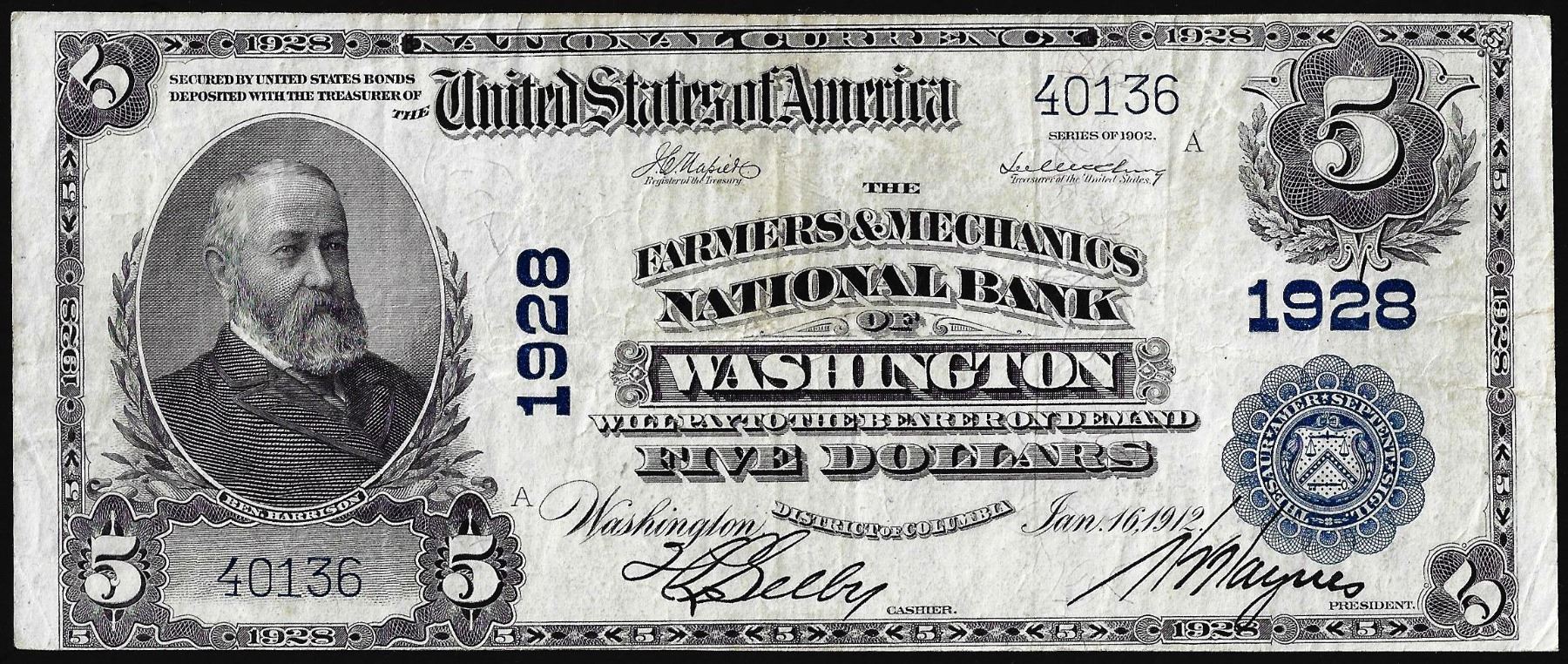 1902 PB $5 F & M of Washington, District of Columbia CH# 1928 National Currency Note