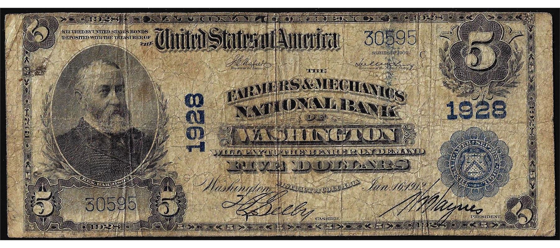 1902 PB $5 F & M of Washington, District of Columbia CH# 1928 National Currency Note