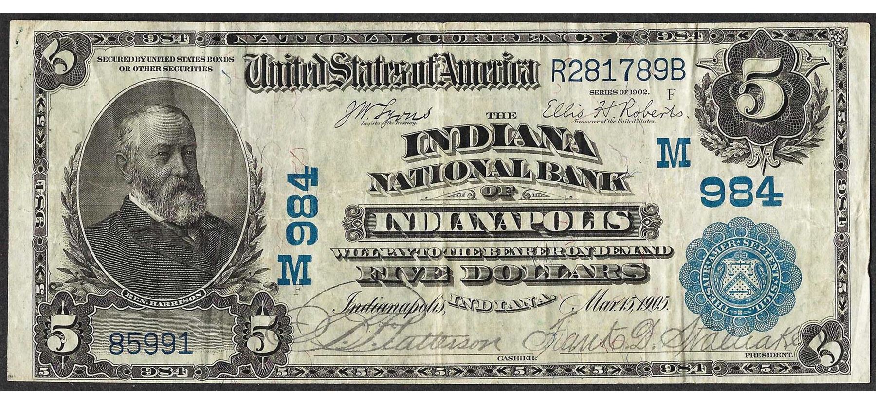 One 1902 PB $5 National Bank of Indianapolis, IN CH# 984 National Currency Note.