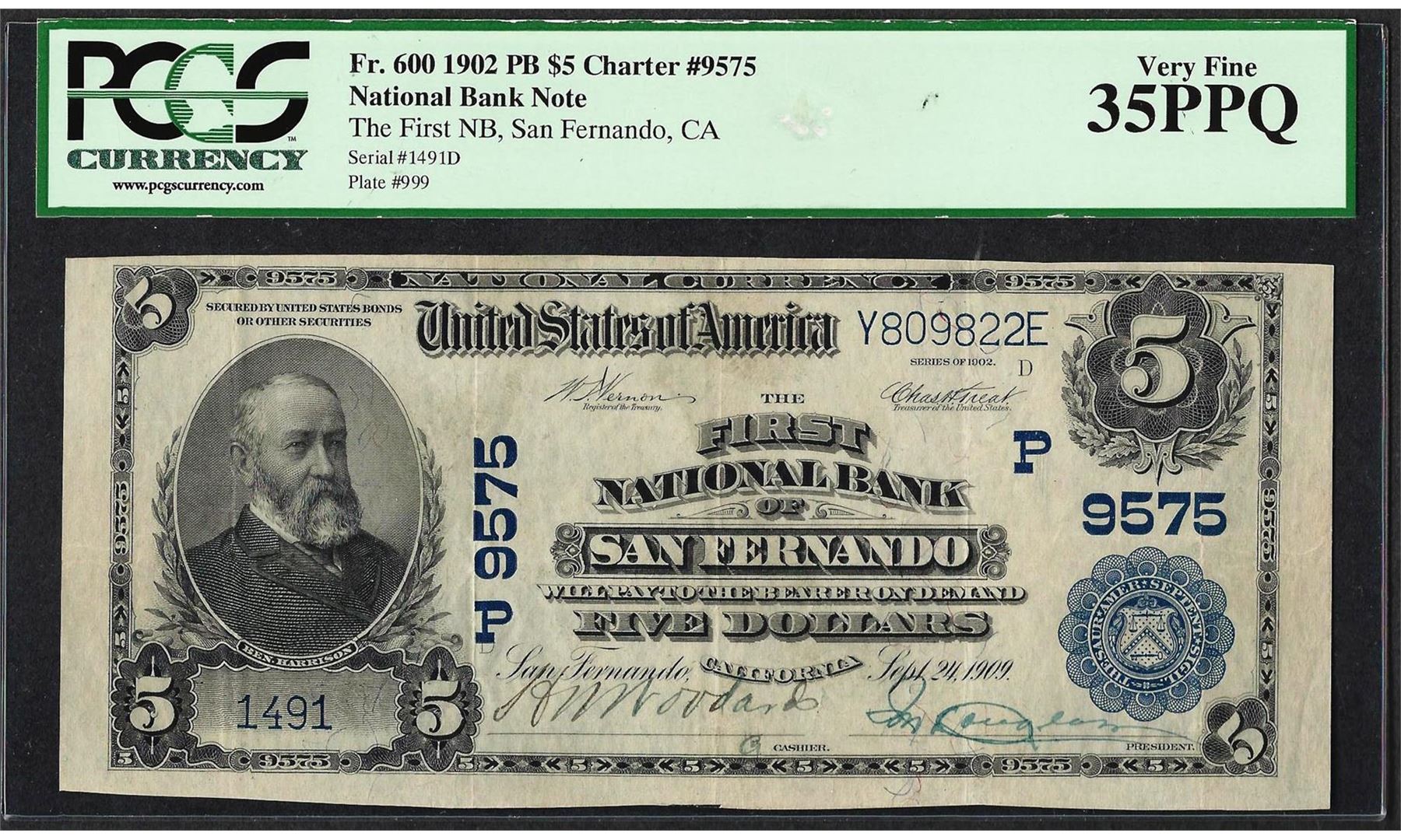One 1902 PB $5 National Currency Note San Fernando, CA CH# 9575 PCGS Very Fine 30PPQ . PCGS Graded.