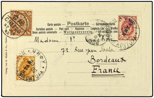1902 Picture postcard to BORDEUX, France, franked 4c. ´Dragon´ tied by CHEFOO date stamp. On reverse also, overprinted 1k + 3k tied by AMOY cds two days later.