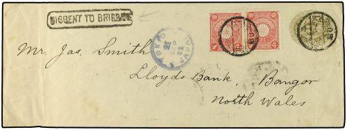 1902 Postal stationary envelope 2 sen olive upgraded with, 4 sen rose (pair) (SG 140) tied by native cds routed via Tokio to Bangor North Wales but miss-sent to Brisbane, New South Wales with scarce handstamp MISSENT TO BRISBANE. Rare item.