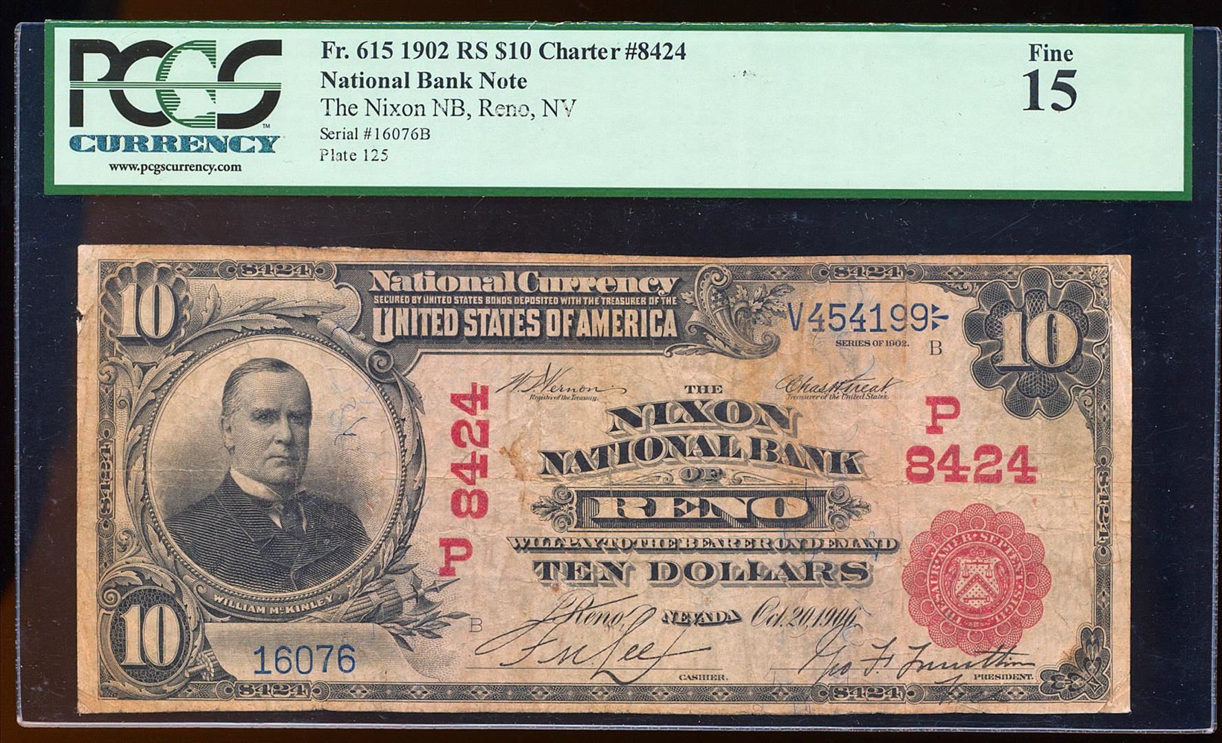 One 1902 RS $10 Reno, Nevada National Currency Red Seal Note CH# 8424 Fr.615 PCGS Fine 15. PCGS Graded.