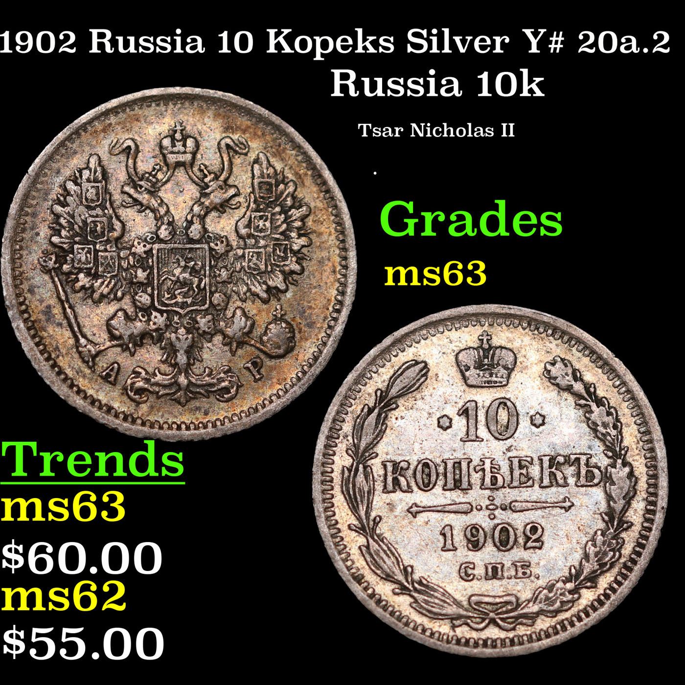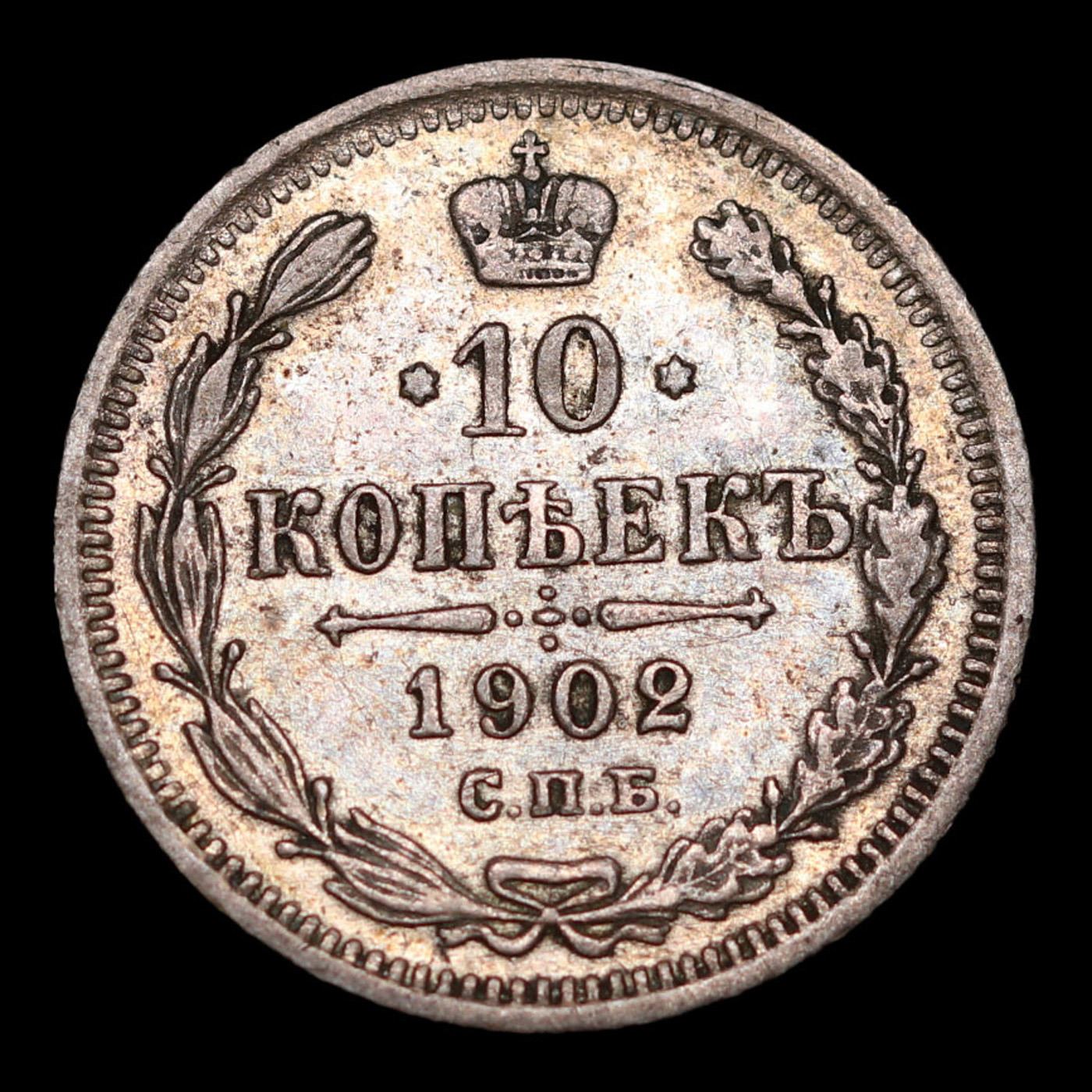 1902 Russia 10 Kopeks Silver Y# 20a.2 Grades Select Unc.