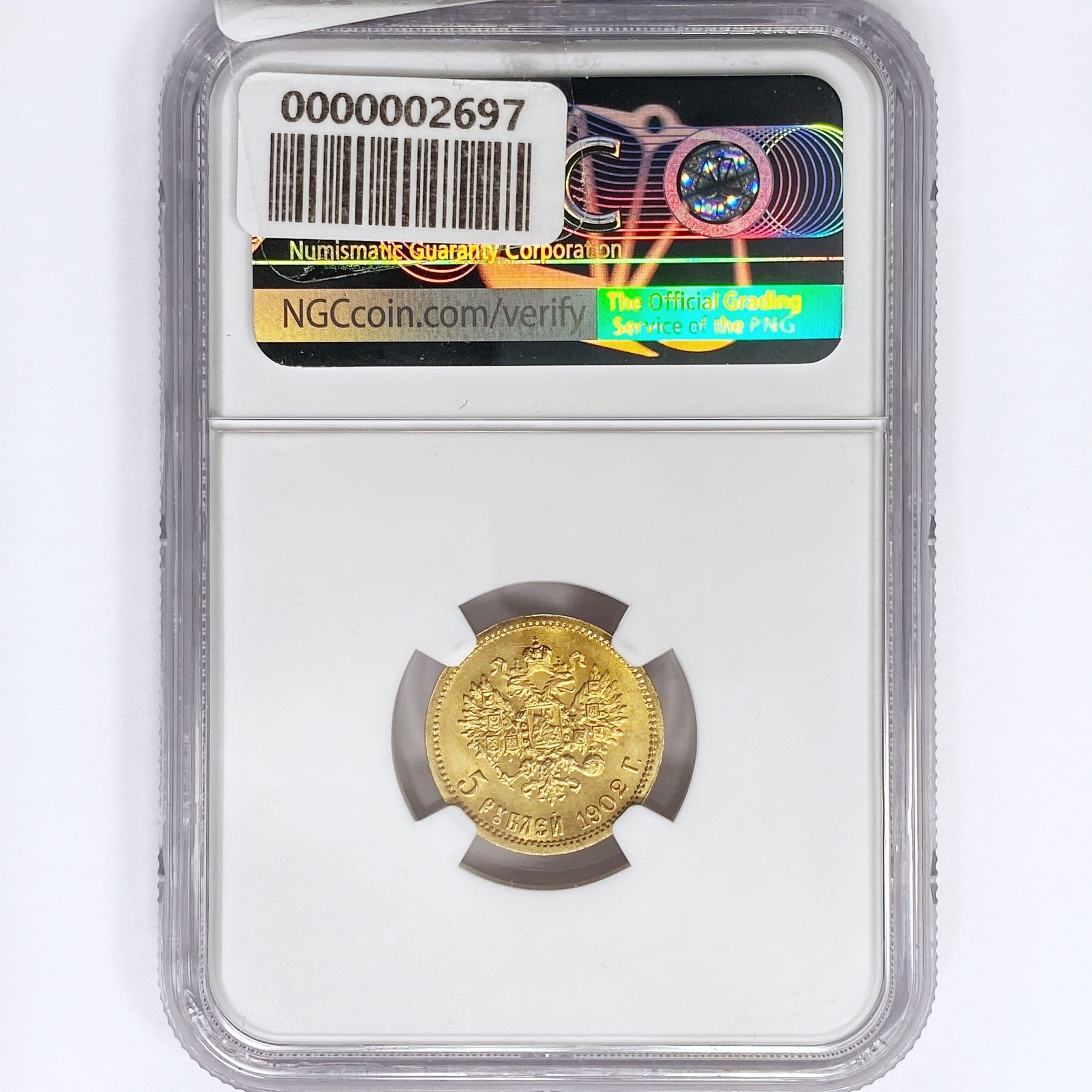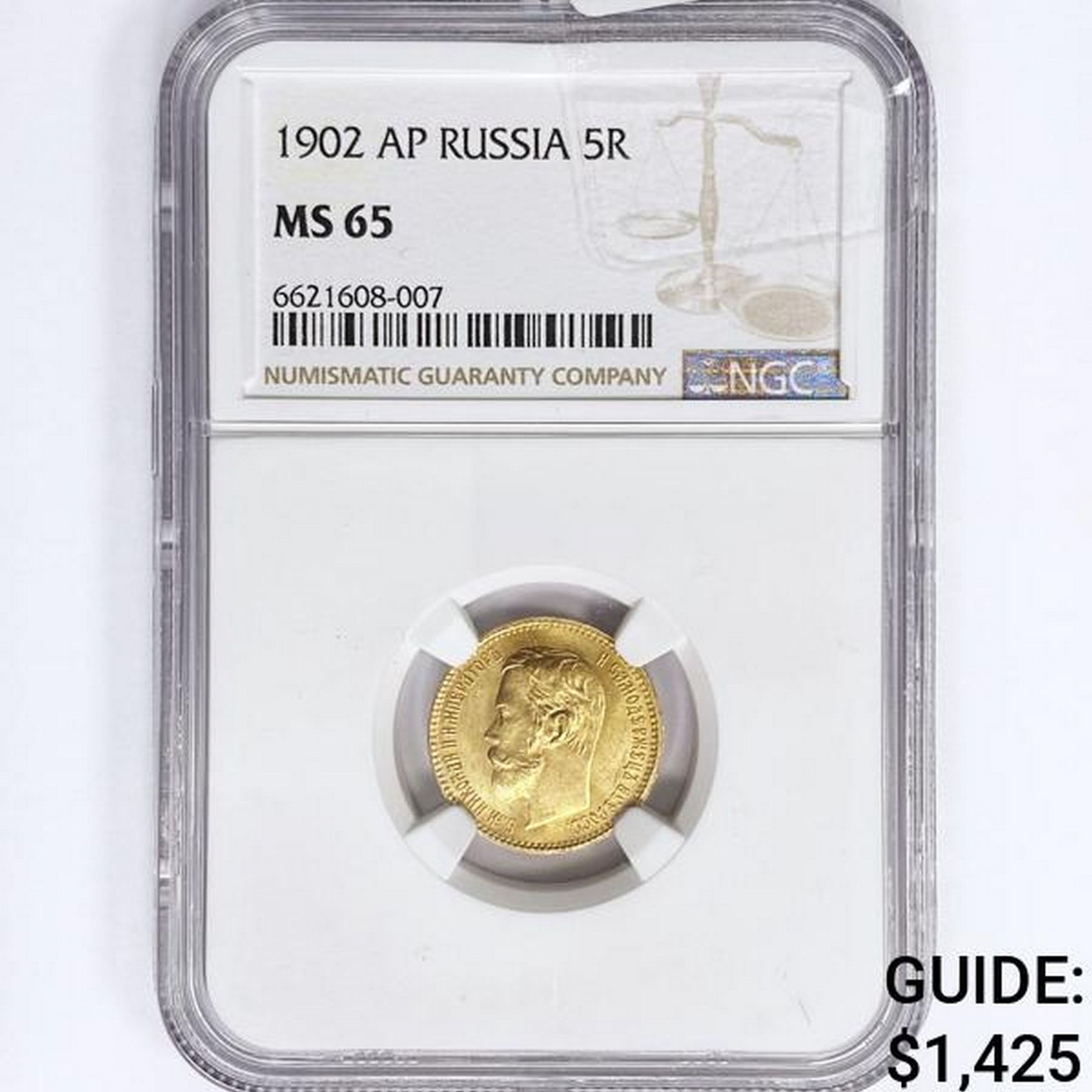 1902 Russia .1245oz Gold 5 Roubles NGC MS65