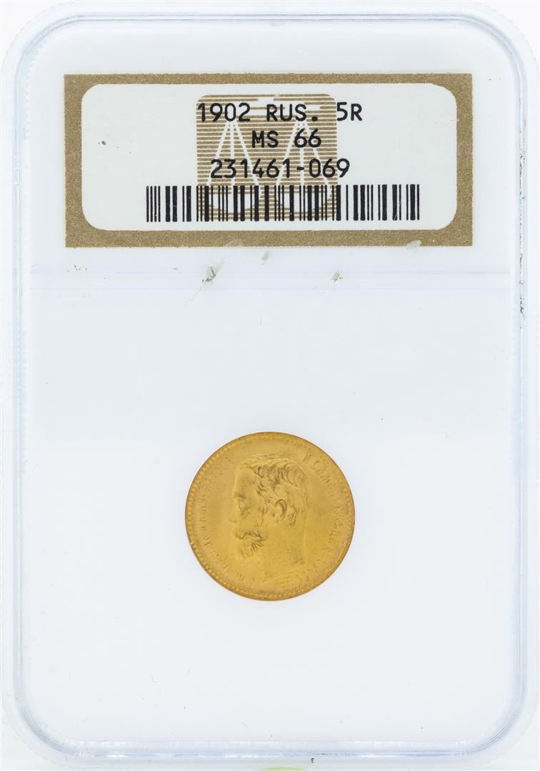 One 1902 Russia 5 Roubles Gold Coin NGC MS66. NGC Certified.
