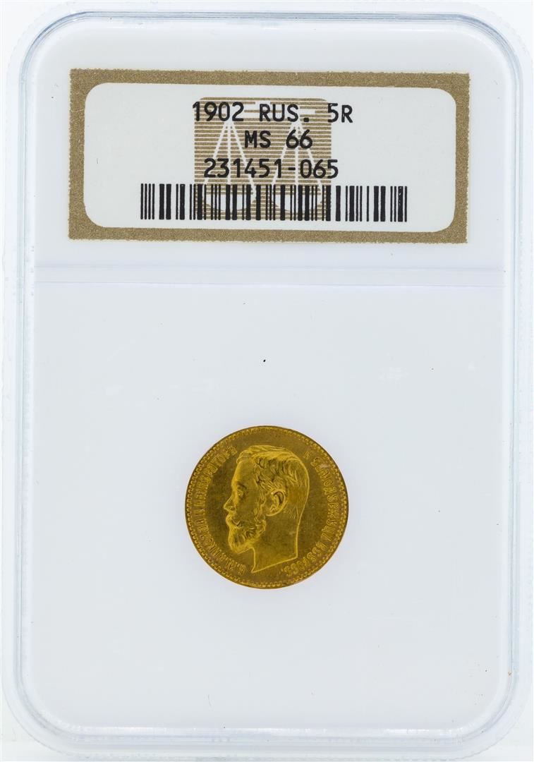 One 1902 Russia 5 Roubles Gold Coin NGC MS66. NGC Certified.