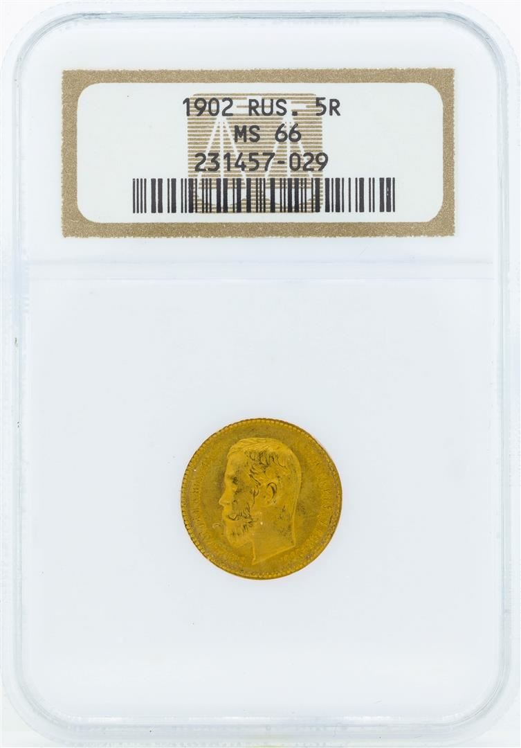One 1902 Russia 5 Roubles Gold Coin NGC MS66. NGC Certified.