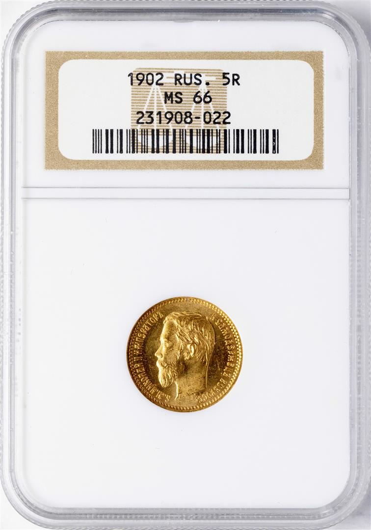 One 1902 Russia 5 Roubles Gold Coin NGC MS66. NGC Certified.