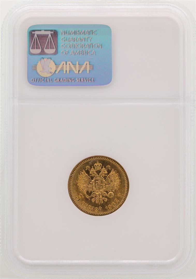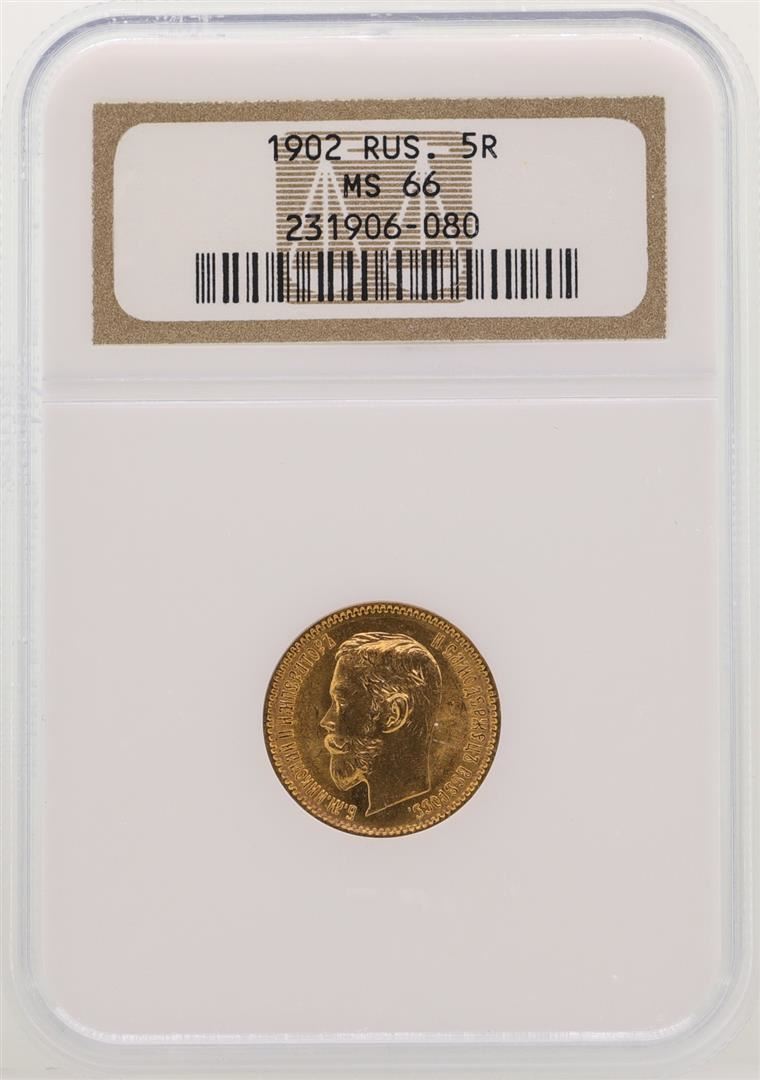 One 1902 Russia 5 Rubles Gold Coin NGC MS66. NGC Certified.
