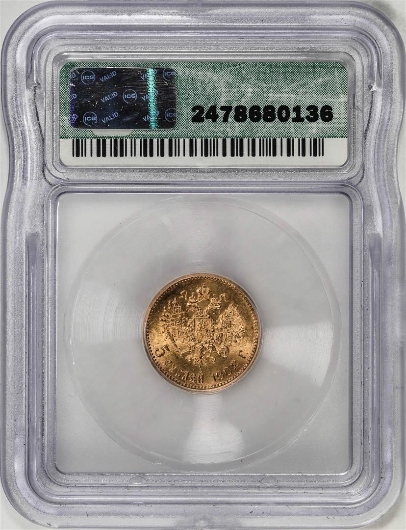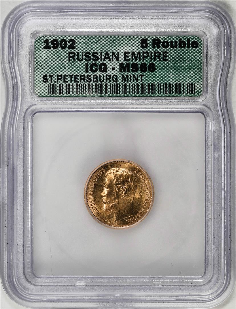 One 1902 Russian Empire 5 Rouble Gold Coin ICG MS66. ICG Certified.
