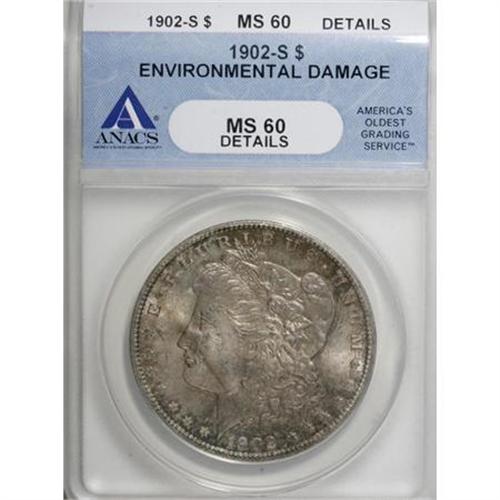 <B>1902-S $1 --Environmental Damage--ANACS. MS60 Details.</B></I> NGC Census: (13/1705). PCGS Population (31/3259). Mintage: 1,530,000. Numismedia Wsl. Price for NGC/PCGS coin in MS60: $300. (#7282)<BR><BR><B>Coin Engraver:</B> George T. Morgan<BR><BR><b>Shipping:</b> Coins & Currency (<a target="_blank" href="http://www.heritageauctions.com/common/shipping.php">view shipping information</a>)