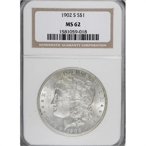<B>1902-S $1 MS62 NGC.</B></I> NGC Census: (240/1354). PCGS Population (495/2591). Mintage: 1,530,000. Numismedia Wsl. Price for NGC/PCGS coin in MS62: $350. (#7282)<BR><BR><B>Coin Engraver:</B> George T. Morgan<BR><BR><b>Shipping:</b> Coins & Currency (<a target="_blank" href="http://www.heritageauctions.com/common/shipping.php">view shipping information</a>)