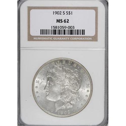 <B>1902-S $1 MS62 NGC.</B></I> NGC Census: (240/1354). PCGS Population (495/2591). Mintage: 1,530,000. Numismedia Wsl. Price for NGC/PCGS coin in MS62: $350. (#7282)<BR><BR><B>Coin Engraver:</B> George T. Morgan<BR><BR><b>Shipping:</b> Coins & Currency (<a target="_blank" href="http://www.heritageauctions.com/common/shipping.php">view shipping information</a>)
