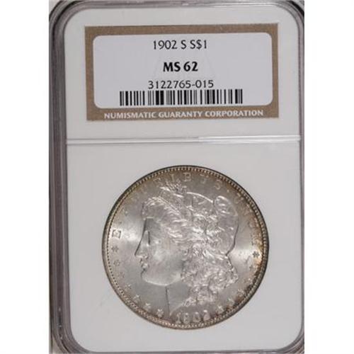 <B>1902-S $1 MS62 NGC.</B></I> NGC Census: (249/1386). PCGS Population (505/2669). Mintage: 1,530,000. Numismedia Wsl. Price for NGC/PCGS coin in MS62: $350. (#7282)<BR><BR><B>Coin Engraver:</B> George T. Morgan<BR><BR><b>Shipping:</b> Coins & Currency (<a target="_blank" href="http://www.heritageauctions.com/common/shipping.php">view shipping information</a>)