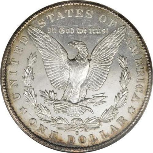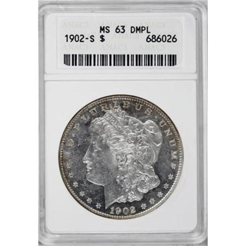 <B>1902-S $1 MS63 Deep Mirror Prooflike ANACS.</B></I> The borders have speckles of iridescent peach patina. This sharply struck piece would approach a full strike except for a hint of weakness on the middle leaf to the left of the wreath ribbon. The fields are deeply reflective, which is extremely rare for this in-demand issue.<BR><BR><b>Shipping:</b> Coins & Currency (<a target="_blank" href="http://www.heritageauctions.com/common/shipping.php">view shipping information</a>)