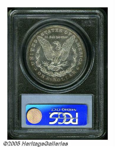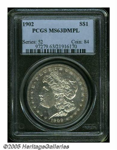 <B>1902<S$1> MS63 Deep Mirror Prooflike PCGS.</B></I> This piece is noteworthy for being the only 1902 Philadelphia dollar certified as a Deep Mirror Prooflike, by PCGS. Well struck with glossy, lustrous surfaces that have a few moderate abrasions on Liberty's face, and in the adjacent field area. The reverse shows better preservation. A slender band of red-brown and sea-green toning guards the peripheries of each side, and there are numerous wispy die striations (as struck) on the reverse. Population: 1 in 63, 0 finer (6/05).