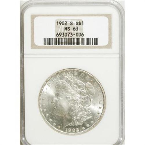 <B>1902-S $1 MS63 NGC.</B></I> NGC Census: (588/791). PCGS Population (1189/1448). Mintage: 1,530,000. Numismedia Wsl. Price for NGC/PCGS coin in MS63: $480. (#7282)<BR><BR><B>Coin Engraver:</B> George T. Morgan<BR><BR><b>Shipping:</b> Coins & Currency (<a target="_blank" href="http://www.heritageauctions.com/common/shipping.php">view shipping information</a>)