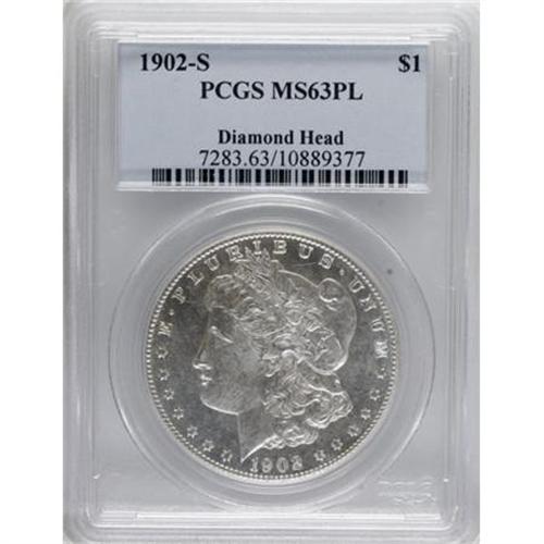 <B>1902-S $1 MS63 Prooflike PCGS.</B></I> Ex: Diamond Head. Delicate gold toning aids the eye appeal of this nicely struck and moderately mirrored better date dollar. Upon initial examination, the grade appears higher than MS63, but a hair-thin vertical line is finally detected on the cheek. Population: 12 in 63 Prooflike, 6 finer (6/07).<BR><I>From the Diamond Head Registry Set of Prooflike Dollars.</B></I><BR><BR><B>Coin Engraver:</B> George T. Morgan<BR><BR><b>Shipping:</b> Coins & Currency (<a target="_blank" href="http://www.heritageauctions.com/common/shipping.php">view shipping information</a>\)