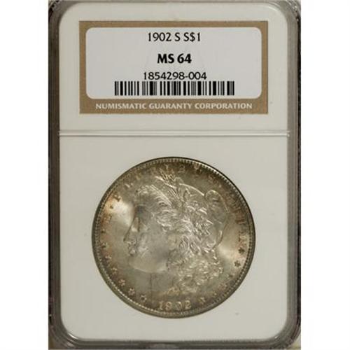 <B>1902-S $1 MS64 NGC.</B></I> A lovely Choice piece, well struck with powerful luster and bands of blue and reddish-orange patina at the periphery. Like the other S-mint Morgan issues of the 20th century, the 1902-S becomes elusive in better grades.<BR><BR><B>Coin Engraver:</B> George T. Morgan<BR><BR><b>Shipping:</b> Coins & Currency (<a target="_blank" href="http://www.heritageauctions.com/common/shipping.php">view shipping information</a>)