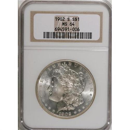 <B>1902-S $1 MS64 NGC.</B></I> Some central weakness, especially on the reverse, is the result of original planchet striations. This near-Gem example has brilliant luster and excellent eye appeal, and it is only a few tiny marks short of a full Gem.<BR><BR><B>Coin Engraver:</B> George T. Morgan<BR><BR><b>Shipping:</b> Coins & Currency (<a target="_blank" href="http://www.heritageauctions.com/common/shipping.php">view shipping information</a>)