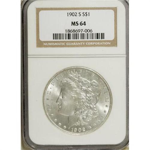 <B>1902-S $1 MS64 NGC.</B></I> A minimally toned silver-gray near-Gem, luminous with pillowy detail on the devices. Both sides show vertical roller marks, with those of the reverse slightly more prominent.<BR><BR><B>Coin Engraver:</B> George T. Morgan<BR><BR><b>Shipping:</b> Coins & Currency (<a target="_blank" href="http://www.heritageauctions.com/common/shipping.php">view shipping information</a>)