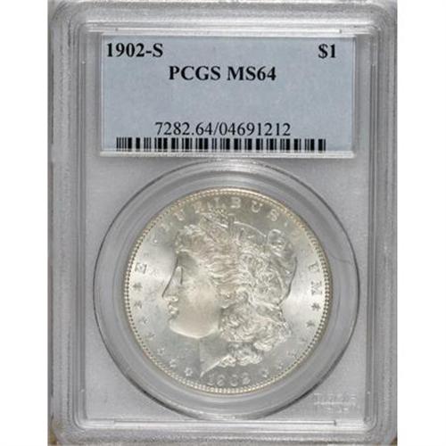 <B>1902-S $1 MS64 PCGS.</B></I> PCGS Population (1142/244). NGC Census: (663/102). Mintage: 1,530,000. Numismedia Wsl. Price for NGC/PCGS coin in MS64: $850. (#7282)<BR><BR><b>Shipping:</b> Coins & Currency (<a target="_blank" href="http://www.heritageauctions.com/common/shipping.php">view shipping information</a>)