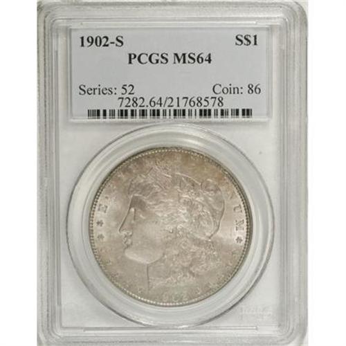<B>1902-S $1 MS64 PCGS.</B></I> Dove-gray and khaki-gold illuminate this satiny and clean-cheeked near-Gem. Minor grazes on Liberty's chin and a few pinpoint flecks on the eagle's body decide the grade.<BR><BR><b>Shipping:</b> Coins & Currency (<a target="_blank" href="http://www.heritageauctions.com/common/shipping.php">view shipping information</a>)