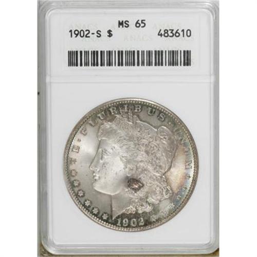 <B>1902-S $1 MS65 ANACS.</B></I> An amazing toned Gem with frosty golden-brown surfaces, ringed by peripheral sea-green and iridescent toning, in a colorful rainbow display. The 1902-S boasts the second lowest mintage of Morgan dollars dated in the 1900s with only 1.5 million pieces struck. <BR><BR><B>Coin Engraver:</B> George T. Morgan<BR><BR><b>Shipping:</b> Coins & Currency (<a target="_blank" href="http://www.heritageauctions.com/common/shipping.php">view shipping information</a>)