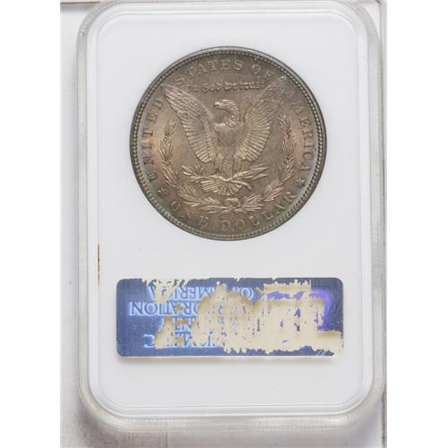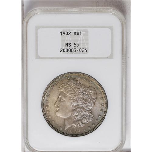<B>1902<img border='0' src='http://www.heritagecoins.com/images/star.gif' width=10 height=10>$1> MS65 NGC.</B></I> Orange-gold and lilac centers are framed by sea-green and powder-blue margins. A smooth and attractive Gem. Housed in an early generation holder.