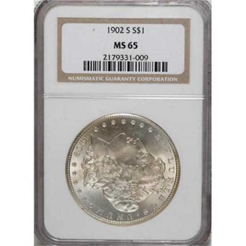 <B>1902-S $1 MS65 NGC.</B></I> A brilliant Gem with light champagne toning on both sides. This is a scarce issue so fine. Census: 95 in 65, 8 finer (8/07).<BR><BR><B>Coin Engraver:</B> George T. Morgan<BR><BR><b>Shipping:</b> Coins & Currency (<a target="_blank" href="http://www.heritageauctions.com/common/shipping.php">view shipping information</a>)