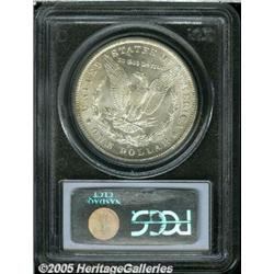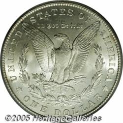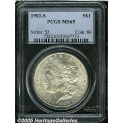 <B>1902-S<img border='0' src='http://www.heritagecoins.com/images/star.gif' width=10 height=10>$1 MS65 PCGS.</B></I> A brilliant Gem that is softly struck at the centers on both sides. A sharper strike would have led to a higher numeric grade as this is nearly perfect, overall. The surfaces are fully lustrous and frosty without any indication of toning, save for a faint trace of gold at the left reverse border.
