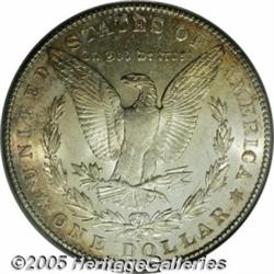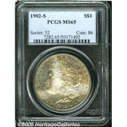 <B>1902-S<img border='0' src='http://www.heritagecoins.com/images/star.gif' width=10 height=10>$1 MS65 PCGS.</B></I> Here is a late date Morgan Dollar that is about as rare in worn condition as it is in the finer Mint State grades. Most Uncirculated examples had entered collectors' hands by the 1950s, after which time the issue's rarity has grown in appreciation among students of the Morgan Dollar series. A solidly graded Gem, both sides are moderately toned in antique-golden, reddish-golden, and blue hues with satiny luster and some intermingling of mint frost. Light striking incompleteness in the centers is typical of the date, but smooth, minimally features are definitely not. This coin would certainly satisfy the most discriminating specialist. Population: 172 in 65, 24 finer (2/05).