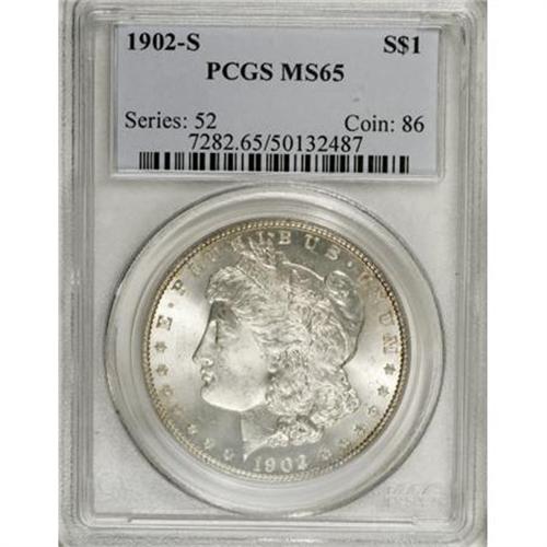 <B>1902-S $1 MS65 PCGS.</B></I> Well struck and highly lustrous, with essentially white surfaces and a bright, satiny appearance. Free of individually noteworthy marks, with just a few minor coin-to-coin traces on each side. PCGS has only graded 29 pieces finer (7/07). <BR><I>From The Arnold & Harriet Collection, Part Two.</B></I><BR><BR><B>Coin Engraver:</B> George T. Morgan<BR><BR><b>Shipping:</b> Coins & Currency (<a target="_blank" href="http://www.heritageauctions.com/common/shipping.php">view shipping information</a>)