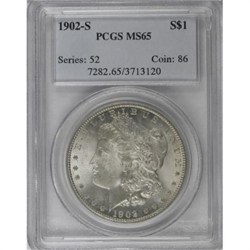 <B>1902-S $1 MS65 PCGS.</B></I> Very well struck for this more challenging 20th century S-mint, with a soft, frosted sheen and minimal abrasions under blushes of delicate golden patina. The 1902-S is eagerly sought in all grades and is an important scarcity at the MS65 level. While generally available in lesser grades, there is a precipitous dropoff in availability of this issue after the MS64 grade.<BR><I>From The Silver Spur Collection of Morgan Dollars.</B></I><BR><BR><B>Coin Engraver:</B> George T. Morgan<BR><BR><b>Shipping:</b> Coins & Currency (<a target="_blank" href="http://www.heritageauctions.com/common/shipping.php">view shipping information</a>)