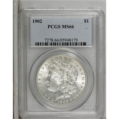 <B>1902 S$1 MS66 PCGS.</B></I> A hint of yellow-gold visits this well struck representative. Cartwheel luster sweeps across the particularly smooth reverse. IN GOD WE TRUST is minutely die doubled north.<BR><BR><b>Shipping:</b> Coins & Currency (<a target="_blank" href="http://www.heritageauctions.com/common/shipping.php">view shipping information</a>)