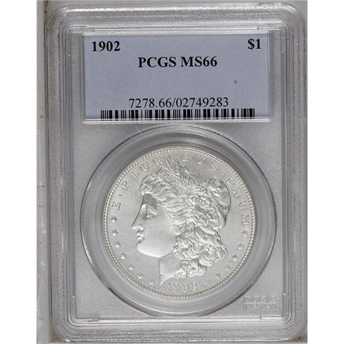 <B>1902<img border='0' src='http://www.heritagecoins.com/images/star.gif' width=10 height=10>$1> MS66 PCGS.</B></I> A lovely and sharply struck example with faint, hazy toning that covers both sides. Beneath the patina, moderate reflectivity appears in the fields.