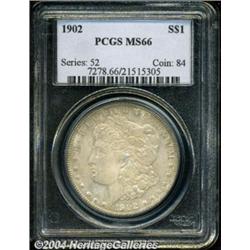 <B>1902<S$1> MS66 PCGS.</B></I> Satiny luster breaks through the creamy dove-gray and bright pink-orange patina. Sharply struck aside from the hair curl above the ear, and the surfaces are lovingly preserved with very few marks. <BR><BR><B>Important notice:</B> Heritage usually auctions material at the rate of 200-250 lots per hour. On some occasions eBay Live bid software or the Internet may not be able to keep up with the pace of the auction. We recommend placing a realistic absentee bid now as insurance to avoid disappointment. Occasionally the auctioneer may eliminate or reject an eBay Live bid, and the auctioneer may also reopen a lot after the close of the eBay live bidding (usually because we missed an audience bid), and may reject your bid even if it shows you as the winning bidder. By bidding via eBay Live, you agree that Heritage may award the lot to another bidder at its sole discretion under the circumstances described above or any other reasonable circumstances. Since eBay bids are not shown to us until we open the lot on the floor, we treat those bids just like floor bids. In most cases the floor responds before the eBay bid is presented to us, due to Internet lag time, so for consistency we have made it a policy that floor bids are always considered first over tie eBay live bids. Also please note that all Heritage lots purchased through eBay Live carry a 20% Buyer's Premium. Please make sure you read the Terms and Conditions before you bid. </span></font></tr></table></td></tr></table>