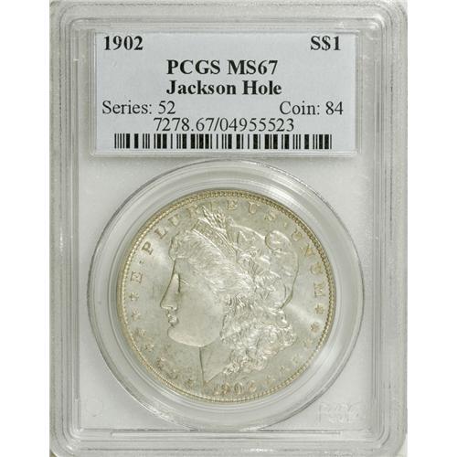 <B>1902 S$1 MS67 PCGS.</B></I> Ex: Jackson Hole. Although the 1902 is readily obtainable in bagmarked Mint State grades, Gems are scarce, and Superb Gems are quite rare. The usual problem is not the strike, which is generally crisp, but most survivors show contact marks on the cheek and fields from long-term improper storage. This honey-gold Superb Gem is a happy exception. The semi-prooflike fields are unmarked, and even the cheek and neck are well preserved. Population: 18 in 67, 0 finer (2/07).<BR><I>From The Jackson Hole Collection.</B></I><BR><BR><b>Shipping:</b> Coins & Currency (<a target="_blank" href="http://www.heritageauctions.com/common/shipping.php">view shipping information</a>)