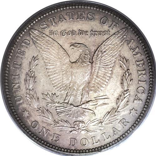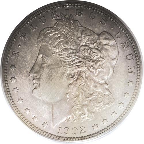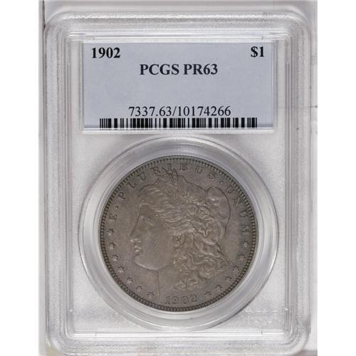 <B>1902<img border='0' src='http://www.heritagecoins.com/images/star.gif' width=10 height=10>$1> PR63 PCGS.</B></I> The surfaces show deep gray-green toning, with glimmers of obverse iridescent blue. This is a well struck piece, but the murky toning largely defeats the luster. Perusal with a loupe reveals few mentionable surface impairments. From a proof emission for the year of 777 pieces.
