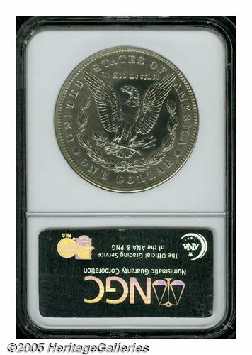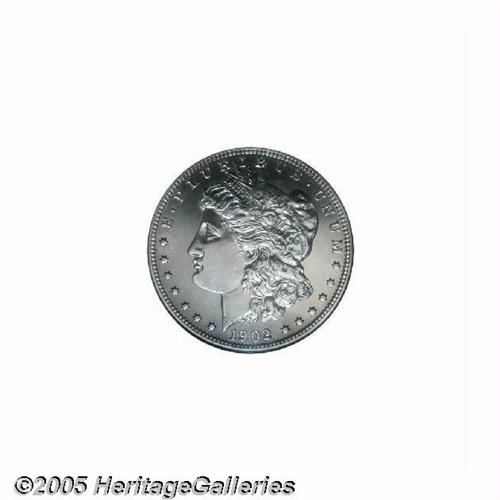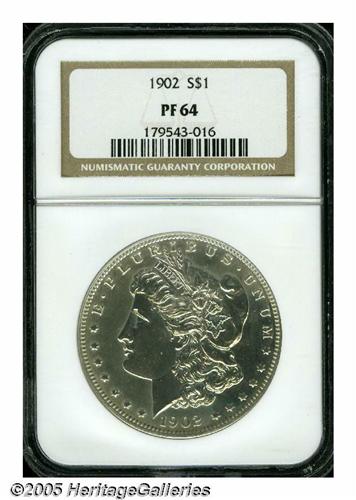 <B>1902<S$1> PR64 NGC.</B></I> This is the first year in which Cameo examples are almost nonexistent. The Mint changed is Proof manufacturing process and found a way to polish the crevices of the die, eliminating the usually seen and highly desirable (today) cameo contrast. In the early 20th century, this contrast was considered less than desirable, and the Mint sought ways to eliminate the cameo appearance. This lovely proof has an untoned chrome-like finish, and the design elements are sharply impressed. A few wispy hairlines in the fields limit the grade.