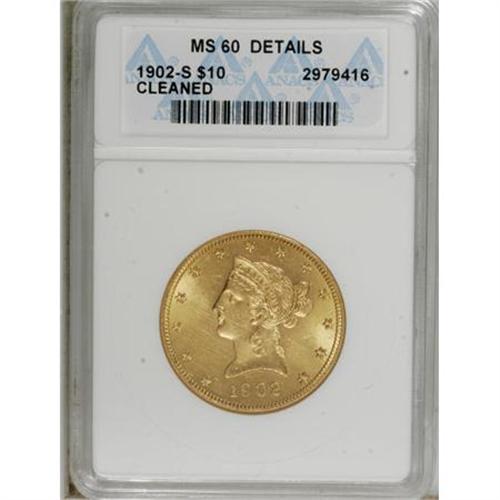 1902-S $10 --Cleaned--ANACS. MS60 Details. NGC Cens