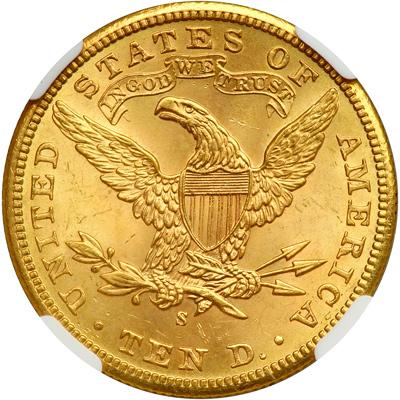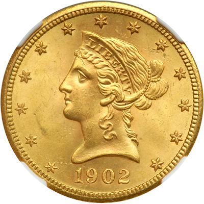 1902-S $10 Liberty. NGC graded MS-64. Well struck with lovely golden mint bloom colors on satiny mint surfaces. A worthwhile addition to ones U.S. Gold Type set (PCGS # 8751) .