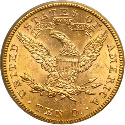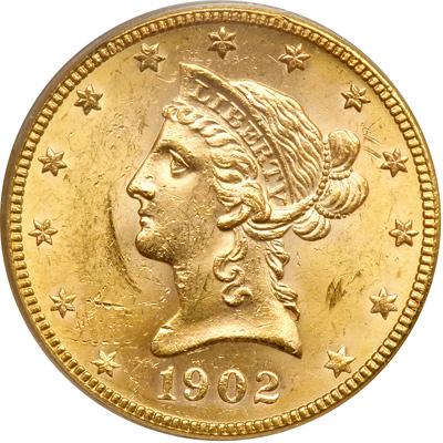 1902-S $10 Liberty. PCGS graded MS-62. Golden tones are scattered throughout on both sides (PCGS # 8751) .