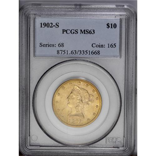 1902-S $10 MS63 PCGS. Select and sharply struck with h